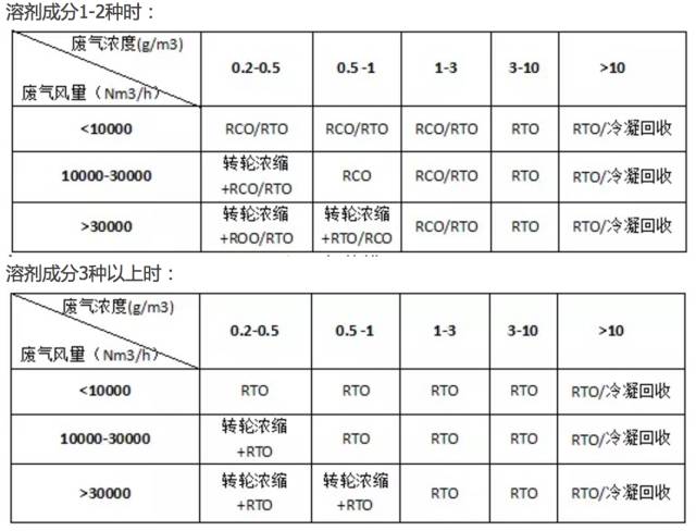 在废气风量、废气浓度和成分知晓的情况下,可以选择相应的处理方式,可以参照下表进行选择(仅供参考):