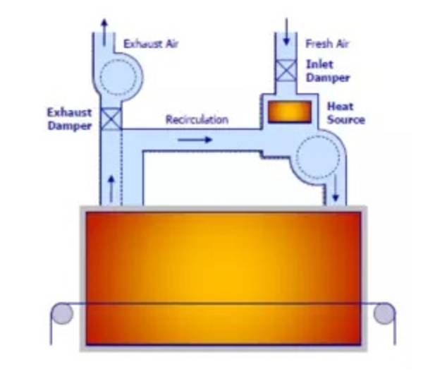 这种烘箱结构客户可以根据工艺情况,在保证安全和不影响产品质量的情况下,增大回用热风的比例,即可降低总的排风量,增加废气排放浓度。但如果废气排放浓度比较高时,为保证安全,需安装LEL监测器, 避免爆炸的风险。